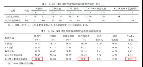 在临床诊断中,多项指标联合检测可有效提高真菌及细菌感染的灵敏度,特异性,阴、阳性预测值等重要指标。