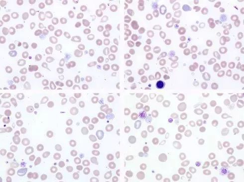 可以看出骨髓纤维化患者血小板内物质含量极低,直方图未见单峰凸起,呈平缓分布形式。因此需要对血片进行观察(图4),看看血小板形态有什么样的改变。下面几幅显微镜图均为瑞姬染色,油镜观察。从这组的四张血涂片中可以看到,PLT数量未见减少,但是血小板呈大小不等,着色浅,颗粒缺失明显,甚至出现无颗粒现象。
