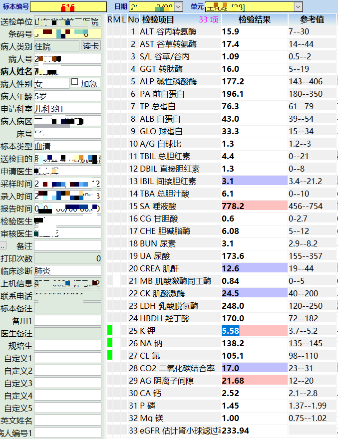 临床结果出现普遍偏低时,首先考虑吸样量不足,排除后再考虑输液侧抽血。那么如何判定是否输液侧抽血呢?首先可以查看历史记录,比较总蛋白、白蛋白这两个项目的波动情况,只有极少数患者会出现均不足参考值一半的情况;其次查看是否有极少见的GLU、K等高值;第三,使用同时抽的另外的一管血(黄帽、绿帽、红帽均可通用)进行复查,如果输液侧抽血则结果的差异会大于检测系统的正常波动;最后是与临床沟通,确定结果是否与临床症状相符。查找各种原因,包括质控在控、定标没问题、比对试验一致、血清标本也没问题,与临床沟通均未找到明确的高血钾的原因,于是请临床重新采血后立即送检,结果如下图:回顾当天的所有钾离子的结果,结果发现儿科当天的钾离子普遍偏高,通过与护理沟通,最终发现原因为采血后送检时间过长。由于当时正处于儿科病患高峰阶段,值班护士为了能够完成当班的抽血任务,从早晨5:00即开始抽血,而且抽血量均不足2mL,从抽血到离心时间长达3个小时左右,从细胞内释放出的钾离子明显增多,导致当天的结果普遍偏高。