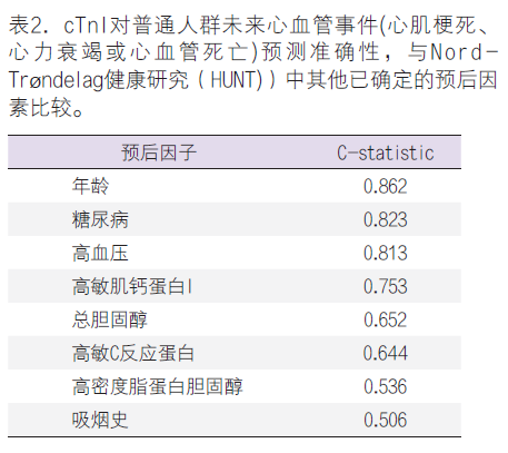 (2)附加价值:对新生物标志物另一个要求是它的附加价值。在Hunt二次分析中,hs-cTnI在加入Framingham评分后,为预测未来的心血管疾病提供了35%的净分类改善(NRI)。43此外,在相同的设置下,与hs-CRP相比,该生物标记物具有更大的C-统计量,当添加到Framingham评分(35% vs 21%)时,能提供比hs-CRP更好的NRI。有趣的是,与已确定危险因素相比,hs-cTnI预测准确性低于年龄、糖尿病和高血压,但仍高于总胆固醇、高密度脂蛋白胆固醇和吸烟状态(表2)。43同样,在BiomarCaRE研究中,当hs-cTnI加入ESC-SCORE评分后能提高对长期心血管风险的预测(NRI,心血管死亡率为0.048,心血管疾病为0.017,总死亡率为0.013)。42