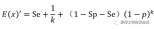 通过混样效能公式可以计算出最佳的混样数量,但是这个公式也存在问题,就是假设混样后的检测方法敏感性和特异性不变。但是实际情况是,一个试剂的敏感性和特异性的验证试验主要针对单检样品获得的。对于混采后的样品的检测,由于病毒浓度降低,针对混样检测试剂的敏感性和特异性也会改变。因此混样检测的效能公式里需引入检测试剂的敏感性和特异性,修改后的效能公式为: