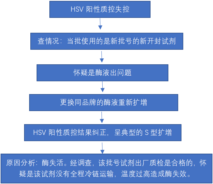 某日检测HSV DNA项目时发现HSV阳性质控检测失败,结果阴性。