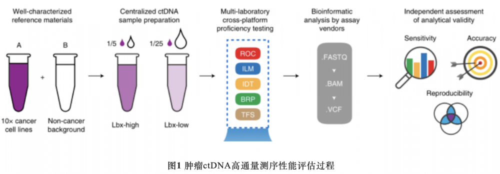大规模的多站点、跨平台ctDNA分析研究中,使用合成参考DNA样本,从十种不同人类癌细胞系中提取的基因组DNA以相同的丰度合并,模拟癌症样本(样本A)。收集的样本以及每个单独的细胞系进行基因分型,在外显子编码区内建立一组约40000个“已知变体”和约10.2MB的“已知阴性”(与每个细胞系中的人类参考基因组相匹配的位置)编码区域,构成参考注释。为了模拟ctDNA实际场景中的VAF范围,将样品A以已知比例与从非癌症背景细胞系(样品B)提取的DNA混合,以创建另外两个参考样品:高Lbx(20%A/80%B)和低Lbx(4%A/96%B),并进行酶切筛选约160–180 bp的DNA片段,模拟体内ctDNA长度与浓度,分配至各平台进行敏感性、准确性、重复性评估。各平台分别采用内部分析流程,提交最终结果供独立团队集中评估,该项目是迄今为止ctDNA测序分析性能的最全面评估。