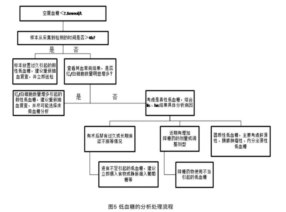 低血糖指空腹血葡萄糖浓度低于2.8mmol/L,轻者可出现头晕、心慌、烦躁、出汗、面色苍白等症状,重者可发生低血糖昏述甚至危及患者生命。低血糖在日常生活中较为常见,若未及时纠正,可导致心律失常、心肌梗死、不可逆的脑损伤,甚至危及生命。因此低血糖结果很重要,在医疗工作流程中低血糖属于危急值管理,需要及时处理。低血糖的诊断主要依靠实验室检查,当检验结果为低血糖,患者也确实发生了低血糖,我们把这种低血糖结果称为真性低血糖。但是,在实际临床工作中,经常出现实验室检查结果为低血糖,而患者没有低血糖症状且实际血糖水平正常,我们把这种低血糖和患者不相符的结果称为假性低血糖,此时按危急值处理反而带来危害。另外,发生低血糖的原因很多,有器质性因素和非器质性因素等。如何正确鉴别真性低血糖和假性低血糖以及明确低血糖的病因从而采取正确的治疗措施一直是临床工作中的难题。这里可以借鉴华西医院建立了低血糖的分析处理流程(如图)。