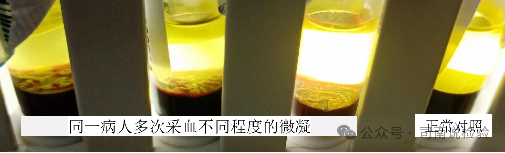 ★标本凝固/凝集/微小凝集的识别:标本状态最容易出问题的是凝固/凝集(有的实验室非自己组内或者流水线处理标本),这个也是做实验前或者审核报告前必须注意的事(在报告审核以前发现问题都不是问题),其凝固/凝集原理上就是体外凝血的启动,或者采样时已经凝集(没有混匀等)、或是在运送过程中被意外激活(震荡、采样管不合格、抗凝剂相对不够等)、或是标本前处理等其他原因(离心力或离心时间不够,或者患者本身疾病状态导致凝血激活或者吸样量不够等)等等,因此,其常表现在标本状态(凝固就是血液凝固了,凝集可见白膜层消失或者褶皱等,下图来源于网络,很清晰,笔者拍摄不出这样好的照片)和实验室结果(凝血启动,消耗Fbg,且APTT检测前有基线期,凝血异常启动对其影响较大,可出现APTT异常缩短,或者凝血启动时间较长消耗大量因子,导致出现结果异常延长,凝血启动导致异常的纤溶激活,导致D-D与FDP的异常)上。