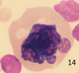 14. 巨大幼红细胞:体积显著大于任何正常幼红细胞。其特点可为胞核染色质细致,多核或有分叶状核。