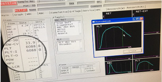 今天继续做住院血分析标本,不知道又会碰到什么我们不可预知的异常结果呢。当我审核结果大概到十点时一个骨科病人的PLT 6088×10^9/L结果当时有点把我吓住了,虽然做了多年的血常规,但从没见过像该病人般极奇高的结果,当时心想这是什么病人结果可以达到如此高的地步,难通是ET、CML、反应性的增高?如果是这些疾病之前见过的最高结果不过2千多,难道是我们的结果有干扰或者仪器出问题了导致了如此高的结果?(我们SYSMEX XE-2100仪器虽已经使用多年,结果还是很稳定)。还是先看看PLT及RBC分布宽度图吧(笔者每审核一个结果都是习惯性的把分布宽度图及散点图一起审核一遍,最大程度的避免一些异常结果漏检。)该患者PLT分布宽度图如下图1,曲线明显异常,向大体积细胞的位置偏移并且有翘尾,浮动坐标也是在40fl位置上。RBC分布宽度图也明显异常向小体积细胞的位置偏移。仪器提示细胞碎片、RBC异常分布、贫血等。再细看红细胞相关参数RBC4.24×10^12/L,HB57g/L↓↓,MCV46fl↓↓,MCH13.4pg↓↓,MCHC292g/L↓↓。