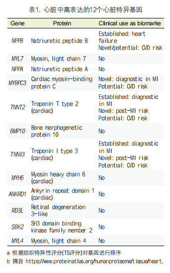 在20000个蛋白质编码基因中,仅有12个蛋白具有心脏组织特异性(表1,摘自https://www.proteinatlas.org/humanproteome/tissue/heart),其中的cTns和利钠肽已进入临床应用。随着人类基因组计划的完成,人们发现了越来越多的ncRNA,并且按照其在基因表达调控中所具备的不同生物学功能分为不同的亚类。ncRNA也可作为CVD中的循环生物标志物。虽然仅有少数ncRNA具有心脏组织特异性,但是可以结合ncRNA和现有蛋白生物标志物或组合不同ncRNA以弥补这一缺陷。