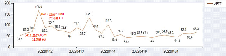 在4月11日、13日、14日凝血功能出现明显异常,其他多数时间都是异常升高状态。4月11日输注血浆600ml,冷沉淀9U。4月12日输注血浆200ml,冷沉淀3U。由于APTT一直处于升高状态,引起关注。