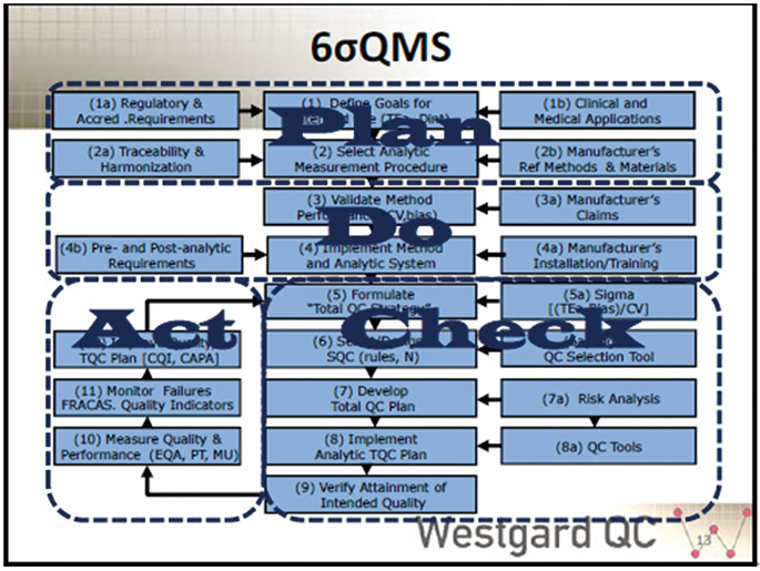 一连串的前奏之后,会议的主角,管理大师James Westgard教授隆重登场,他一再强调质量管理是一个系统(System),并非单个的模块,因此他提出了新的6σQMS(六西格玛质量管理系统),该理论与PDCA循环也有很好的呼应。我们首先制定质量标准,选择实验室程序,进行质量控制、质量评估,发现了问题并进行质量改进,然后重新制定质量计划,使实验室得到持续性改进。由于时间有限,Westgard教授没有进一步具体阐释理论6σQMS的细节。