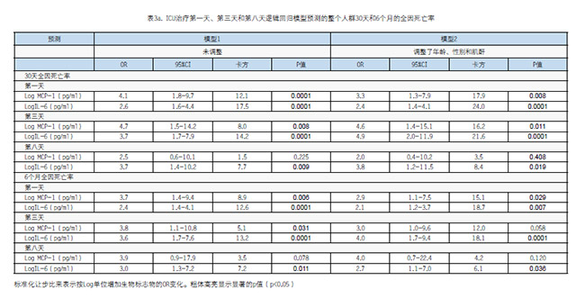 多变量逻辑回归模型分析的年龄、性别和肌酐等参数进行了调整。调整后,基于ICU第一天和第三天治疗后的测量结果,MCP-1水平显著与30天全因死亡率显著相关。调整后,IL-6仍显著与每天的测量结果连续有关(p<0.02)(表3a)