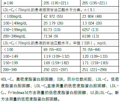局限性包括虽然医学方案要求在样本采集前空腹10-12小时但仍然不知道具体的空腹时间。不过,以前的研究表明空腹时间对餐后甘油三酯浓度的初始绝对增长和随后的LDL-C估计影响很小。此外,VLDL数据库没有报告每名患者在采集血脂样本时使用的药物。尽管如此,临床指南仍然支持在空腹和非空腹状态下使用纵向LDL-C评估,不管有没有同时进行降脂治疗。虽然我们有患者的年龄和性别信息,这是可能影响甘油三酯水平和甘油三酯/VLDL-C比值方差的2个因素,但是没有分析其它因素比如胰岛素抵抗、种族和肥胖。而且我们只用第一份可用的患者血脂样本。连续样本之间的个体内变异可影响LDL-C分类。但是,我们的样本量确保了研究中每一组都分析了足够数量的患者。