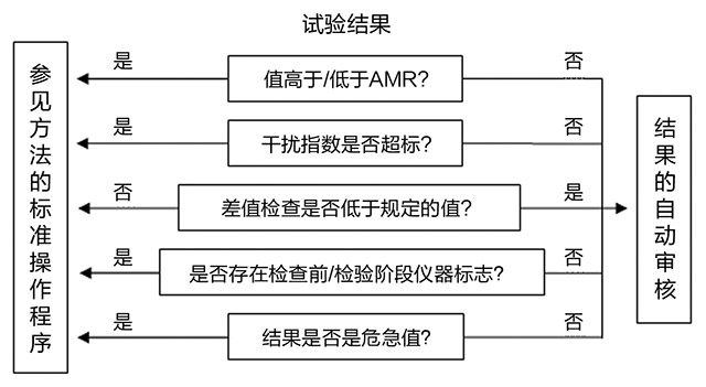 在实验室信息系统(laboratory information system,LIS)中可以实现自动审核算法,可以作为独立的验证程序,或也可以中间件软件引入来连接LIS和实验室分析仪器。自动审核算法适当的设计和自动审核规则的定义是实施算法的先决条件。由于自动审核基于预先定义的规则确保实验室试验结果统一的和客观的审核,因此必须清楚和明确地定义所有选定的规则。自动审核规则通常包括分析测量范围(analytical measurement ranges,AMRs);溶血、黄疸和脂血的干扰指数;分析仪器产生的所有检验前和检验中的标志;参考范围和决定限;危急值;差值(delta)检查;质量控制(QC)结果;移动均值和批检查。