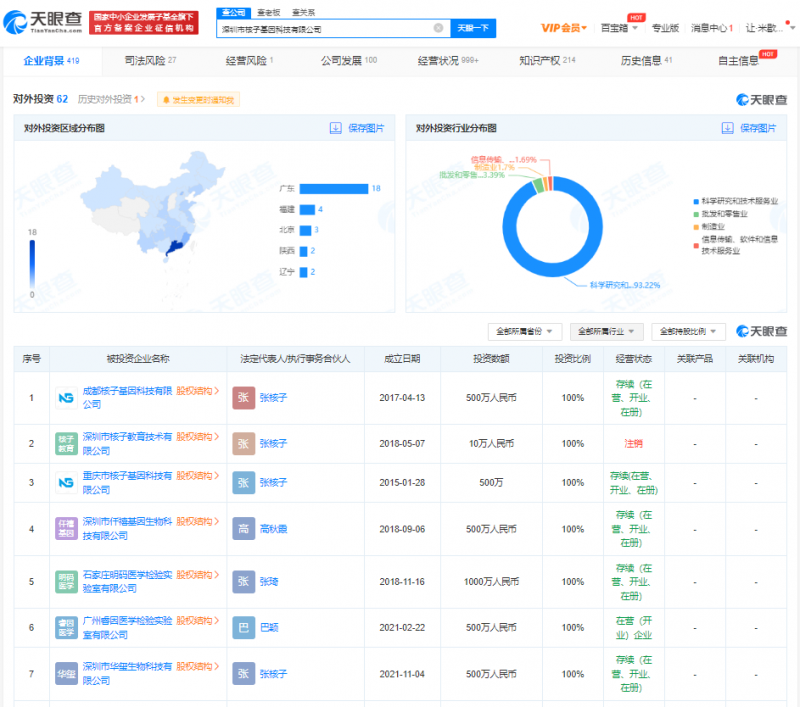 天眼查显示,深圳市核子基因科技有限公司成立于2012年4月,法定代表人为张核子,注册资本约3707万人民币,经营范围包括基因检测产品的技术开发;与基因相关的技术开发;生物制品技术开发等,由张核子、巴颖、深圳市红业实业合伙企业(有限合伙)等共同持股。其中,张核子持股比例约64.7%,为第一大股东和疑似实际控制人。该公司共对外投资62家企业,其中在业、存续状态的有55家,包括深圳市核子健康科技有限公司、长沙核子华曦医学检验有限公司、深圳市核子生物科技有限公司等,版图涉及基因科技、医学检验、网络技术等。分布在28个省份,全国仅西藏、青海、山西以及港澳台未覆盖。不过,其全资子公司深圳核子华曦医学检验实验室对外投资2家公司,分别位于山西太原、青海西宁。也就是说,核子基因旗下企业已分布在全国30个省份,仅西藏和港澳台未覆盖。