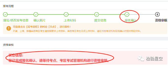 经小程序报名:经过报名点或考点确认后,【报名确认】节点变为蓝色,同时【资格审核】节点变为深蓝色。