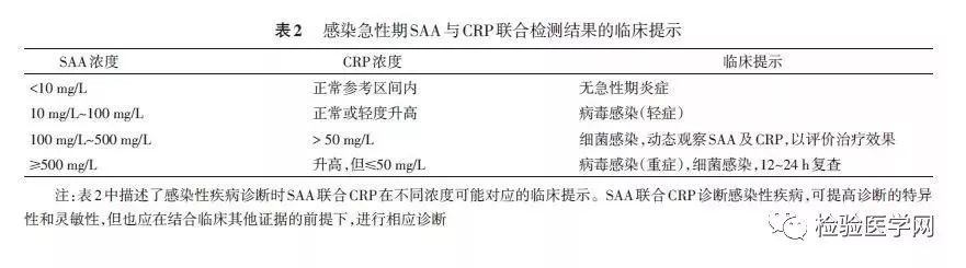 目前,临床常用的炎症标志物有多种,在感染性疾病的诊断、分层、治疗监测及预后评价中发挥重要作用,尤其对指导抗生素的合理使用有很大的帮助。SAA作为血清学炎症标志物,在机体急性感染过程中发挥重要作用,与现有的血清学标志物相比有明显的优势。SAA在感染急性期3~6h内迅速升高,并且在疾病的恢复期迅速下降;在病毒感染性疾病中,SAA显著升高,CRP不升高;在细菌感染性疾病中,SAA的敏感性高于CRP,上升早、幅度大。