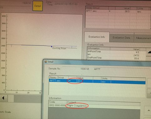 这时凝血11项部分结果出来了,但是仪器有“*”报警,说明是低可信结果。查看其曲线,曲线特别平直。这样的曲线和PT 19.9S明显不符,报警提示为“Slight Coagulation”(SC) ,如图2-1、图2-2。查看FIB结果为3.19g/L,APTT结果为110.1S,凝血因子Ⅱ、Ⅶ、Ⅸ、Ⅹ明显降低,因子Ⅴ、Ⅷ正常,TT正常。查看整张结果,再一次确定PT 19.9S是不可信的。于是重新确认标本是否合格,上机复查PT,结果又出现了表示低可信的“*”报警,报警信息显示如图3-1、图3-2: