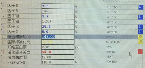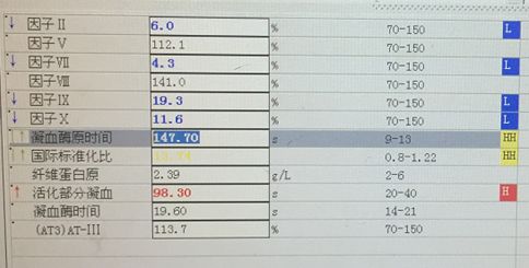 凝血因子Ⅱ、Ⅶ、Ⅸ、Ⅹ是依赖维生素K的凝血因子,严重缺乏的原因有很多。这种案例出现过,原因有华法林过量、鼠药中毒等。为了解病情,继续追踪患者的情况。第二天患者的血常规、纤溶二项、肝功能结果正常,凝血分析结果明显好转,如图4。咨询主管医生,主管医生表示昨晚给患者补了维生素K并且输了血浆,具体什么原因导致的维生素K缺乏现在还不明确。