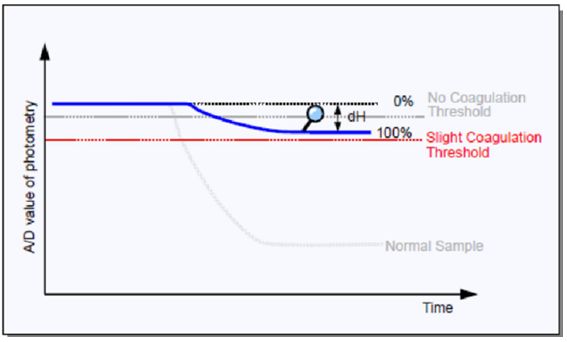 3、CS-5100报SC/NC时,由于仪器是通过设定“Slight Coagulation Threshold”和“No Coagulation Threshold”两个临界值来设定报警的,即∆dH在0%~NC Threshold时报NC,在0%~SC Threshold时报SC。由于0%~NC在0%~SC范围内(见图7),所以会出现把NC报警成SC的情况,上述案例中已说明。因此在出现SC报警时,一定要查看凝固曲线,了解病情,复核标本,切勿盲目审核结果。