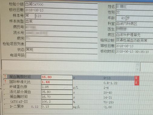 采用手工法复查PT,未出现凝集。一个门诊病人PT和APTT都这么高,万一出现大出血就会十分危险。由于已经是下班时间,与开单医生未取得联系,出于对患者的负责,我找到患者的电话,直接与她联系。询问患者最近是否有服药。患者表示并未服药,只是牙龈无故渗血,身上出现很多瘀青。这时患者已经在回家的车上,为了不出现险情,我让她立即返回医院。由于检验结果出现了危急值,我继续联系开单医生,并最终取得联系。和他沟通了解患者病情之后,开单医生将安排患者住院治疗。一个小时之后,患者到达医院,精神状态尚可,我让她立即前往住院部血液内科就诊。
